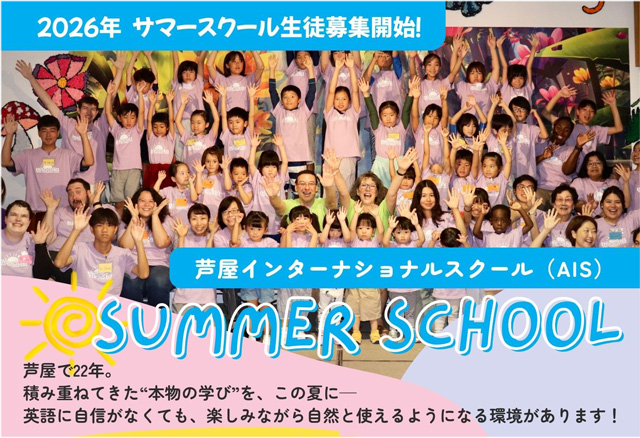 芦屋インターナショナルスクール(AIS)では、イースター(生誕祭)や卒業セレモニーなどの学内イベントや地域老人ホームでの合唱など、様々な催しを行っています。サマースクールのインフォメーションは5月末に掲載する予定です。